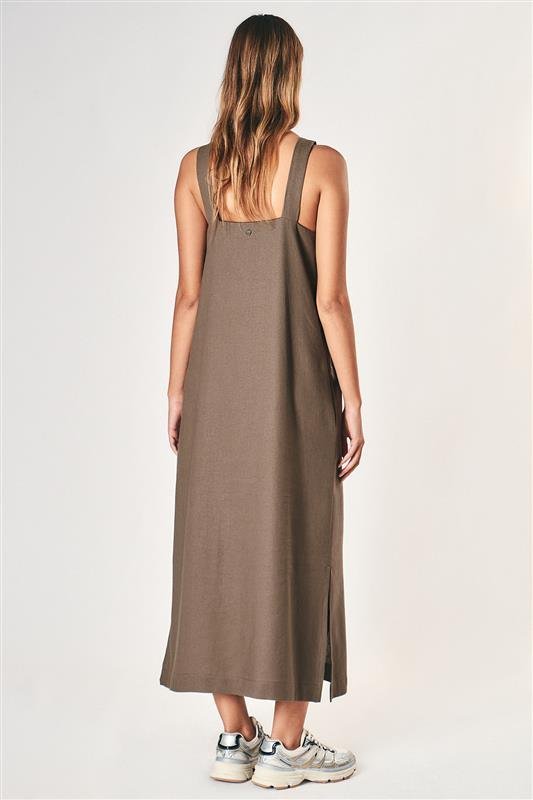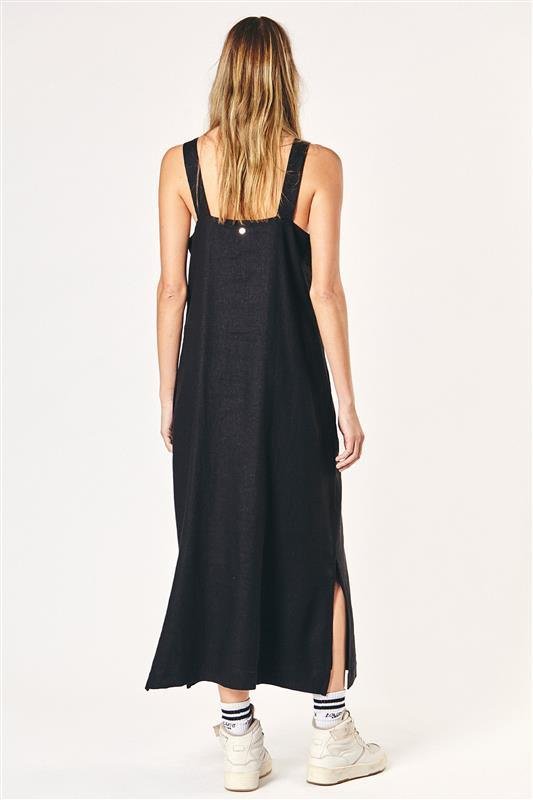 Vestido largo confeccionado en lino, de corte recto con silueta relajada. Cuello redondo, una espalda amplia y tajos laterales que aportan movimiento.