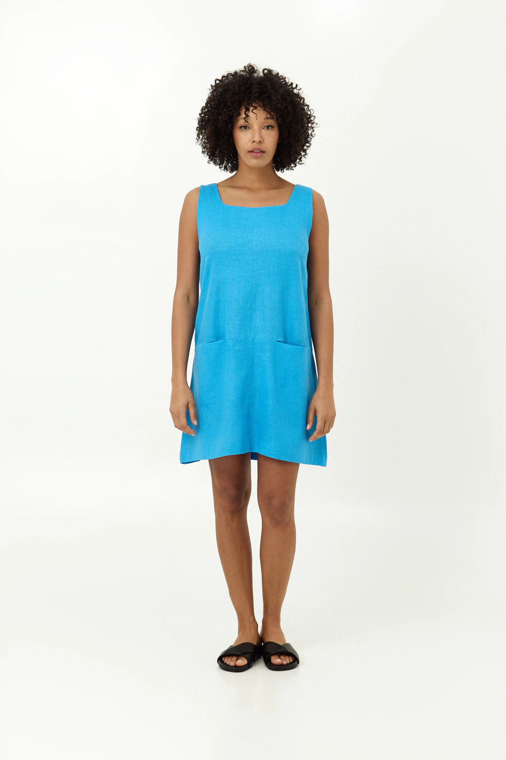 Vestido corte básico confeccionado en LINO Blend. Escote cuadrado alto y bolsillos en el frente.