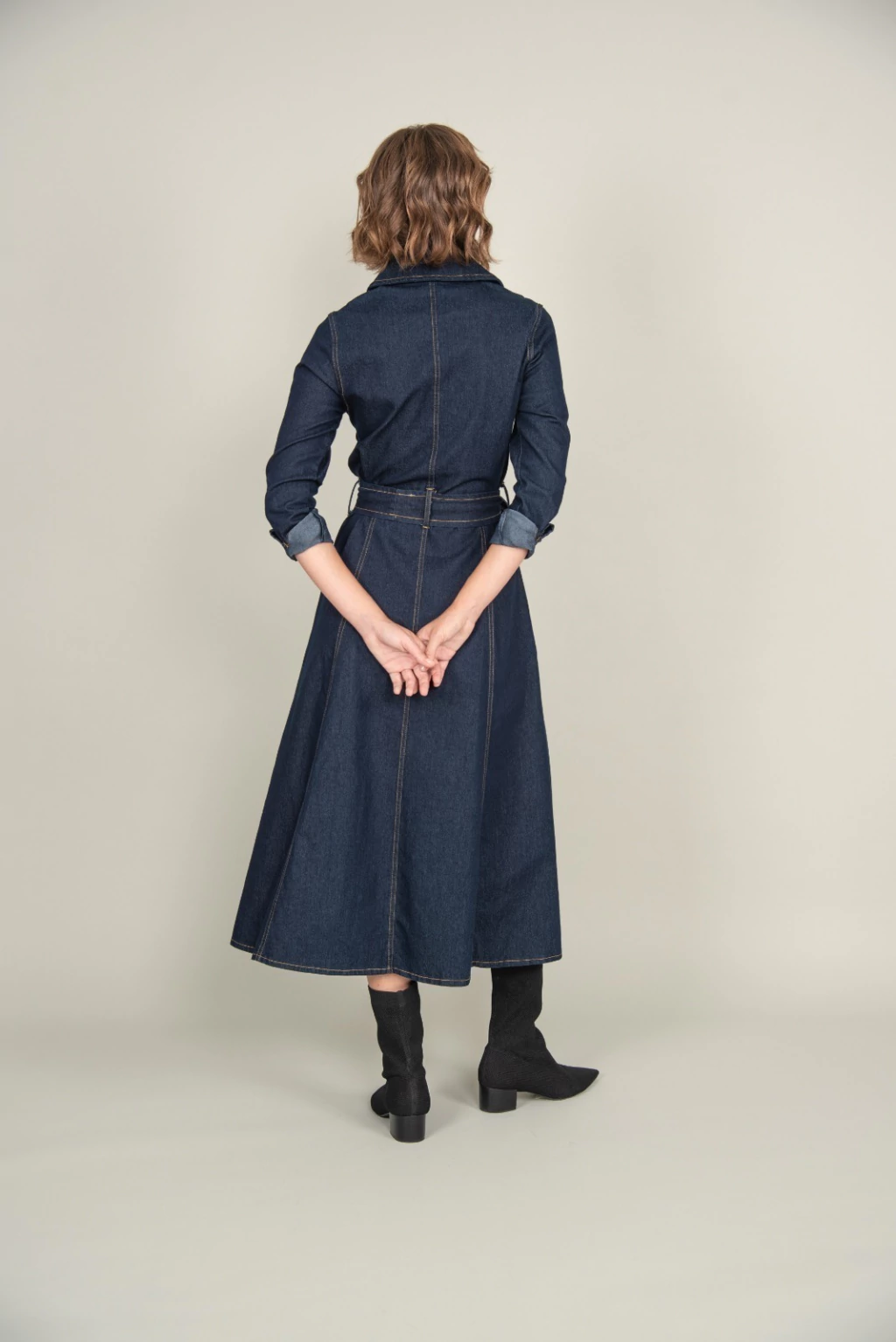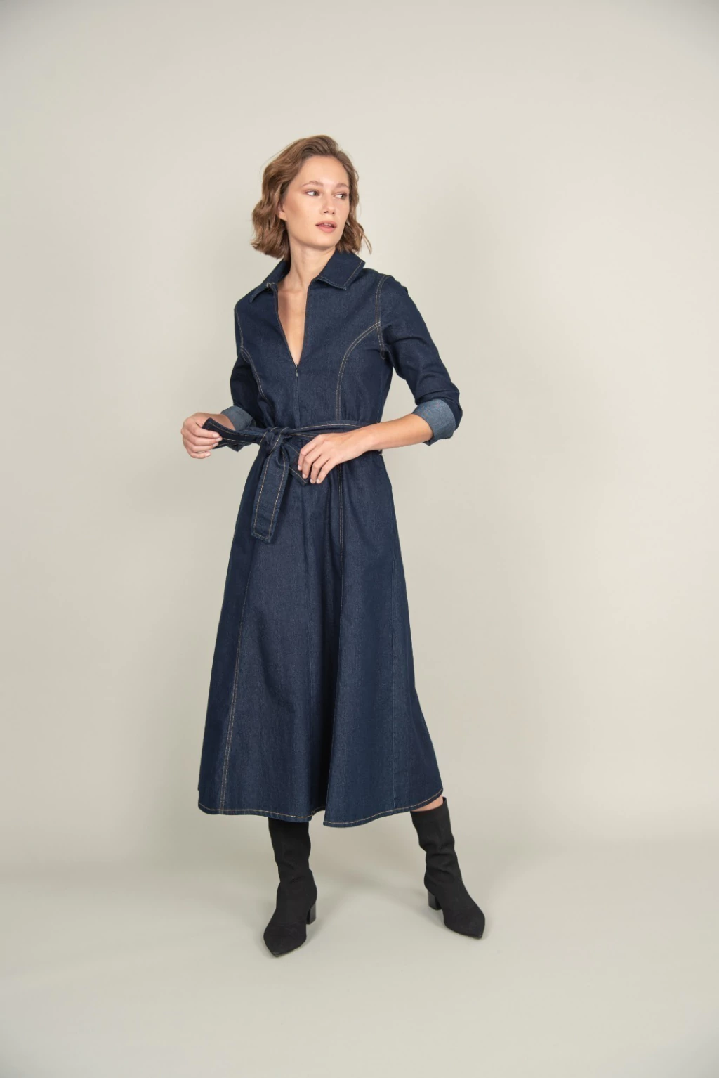 Vestido de denim manga larga con recortes en el frente y lazo desmontable para atar en cintura.